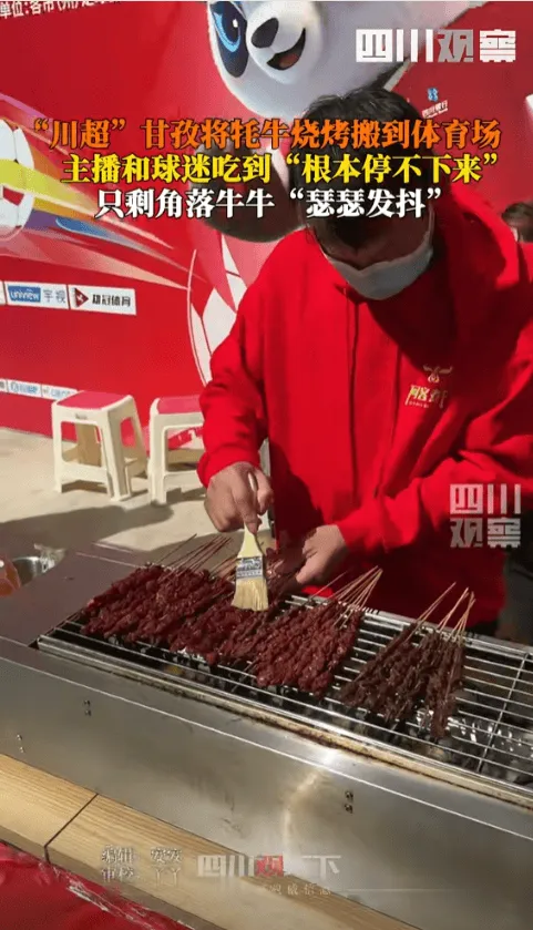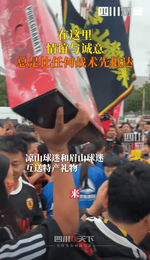 看臺上飄著“敢打敢拼川漢子”的紅橫幅,場邊小販的冰粉攤被球迷圍得里三層外三層。連客場球迷剛出高鐵站,就有攥著油果子的本地大叔湊上來:“看球哇?跟到我走,順路帶你吃最巴適的羊肉格格!”