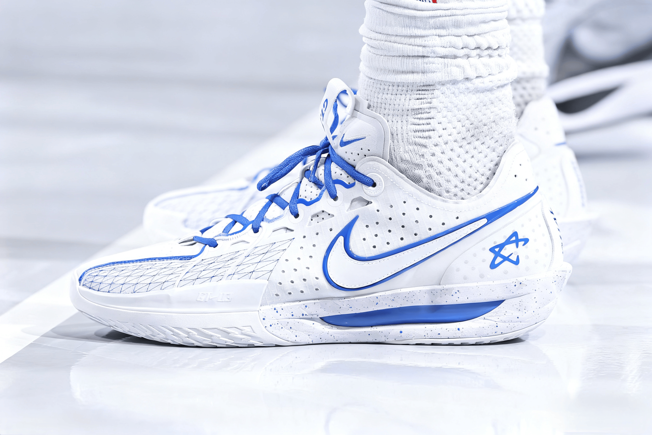 比賽中,坎寧安上腳白藍(lán)色Nike G.T Cut3 PE。
