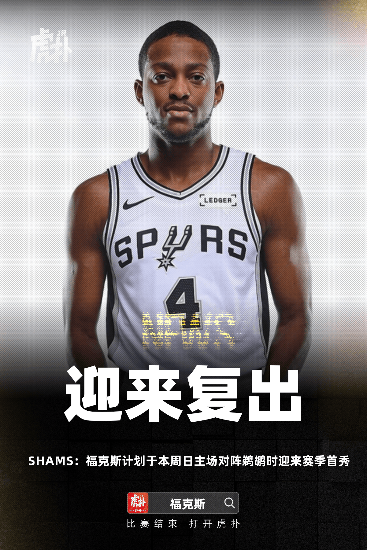 虎撲11月08日訊 今日,據(jù)ESPN記者Shams報(bào)道,??讼⑷耸客嘎叮褂?jì)馬刺球星達(dá)龍-??怂褂?jì)劃于本周日主場(chǎng)對(duì)陣鵜鶘時(shí)迎來(lái)賽季首秀。劃于鶘