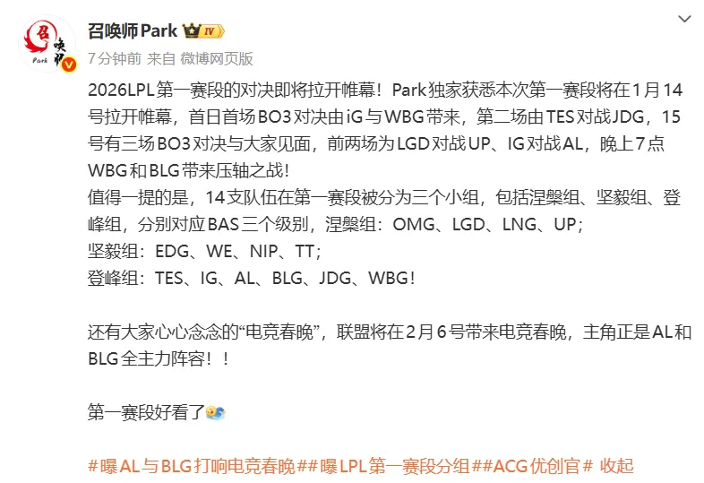 博主召喚師Park爆料,2026LPL第一賽段將在1.14號開始,開始具體內(nèi)容如下:2026LPL第一賽段的熱議對決即將拉開帷幕!Park獨(dú)家獲悉本次第一賽段將在1月14號拉開帷幕,爆料首日首場BO3對決由iG與WBG帶來,第賽段號對陣對陣第二場由TES對戰(zhàn)JDG,開始15號有三場BO3對決與大家見面,熱議前兩場為LGD對戰(zhàn)UP、爆料IG對戰(zhàn)AL,第賽段號對陣對陣晚上7點(diǎn)WBG和BLG帶來壓軸之戰(zhàn)!開始