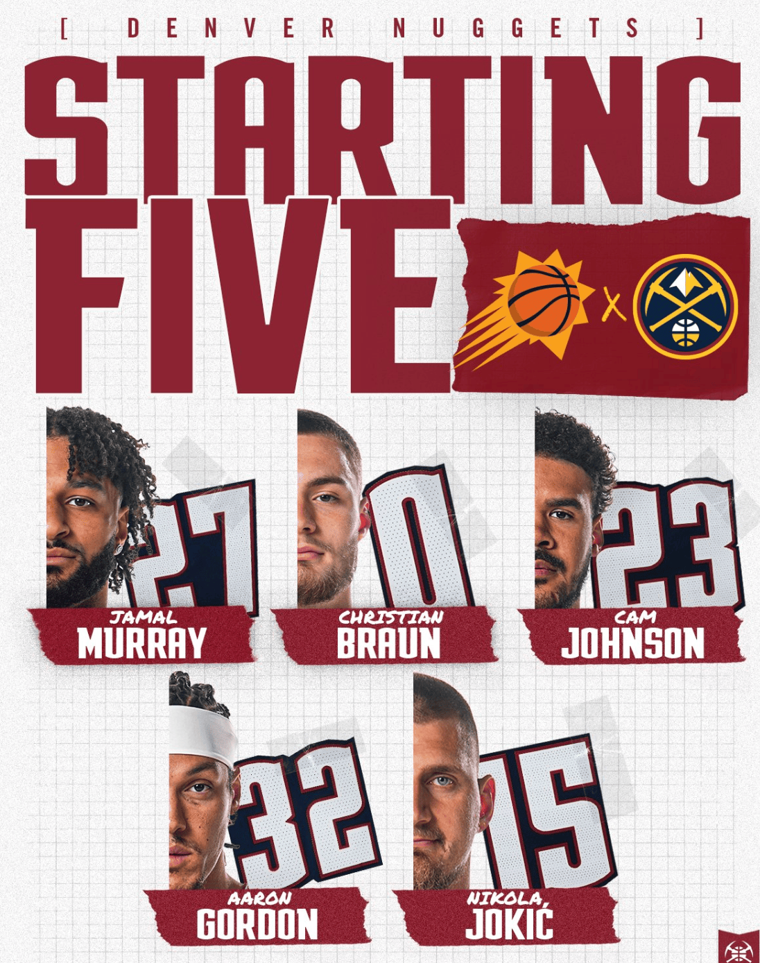 賽前,遜戈掘金官方公布球隊(duì)本場(chǎng)比賽首發(fā)陣容:賈馬爾-默里、克里斯蒂安-布勞恩、卡梅倫-約翰遜、阿龍-戈登和尼古拉-約基奇。