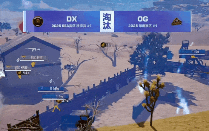 TT想要搶占GEEK的房區(qū),結(jié)果被遠(yuǎn)處其他隊(duì)伍偷襲,汰R淘汰隨后GEEK出來對(duì)槍收下了TT三人