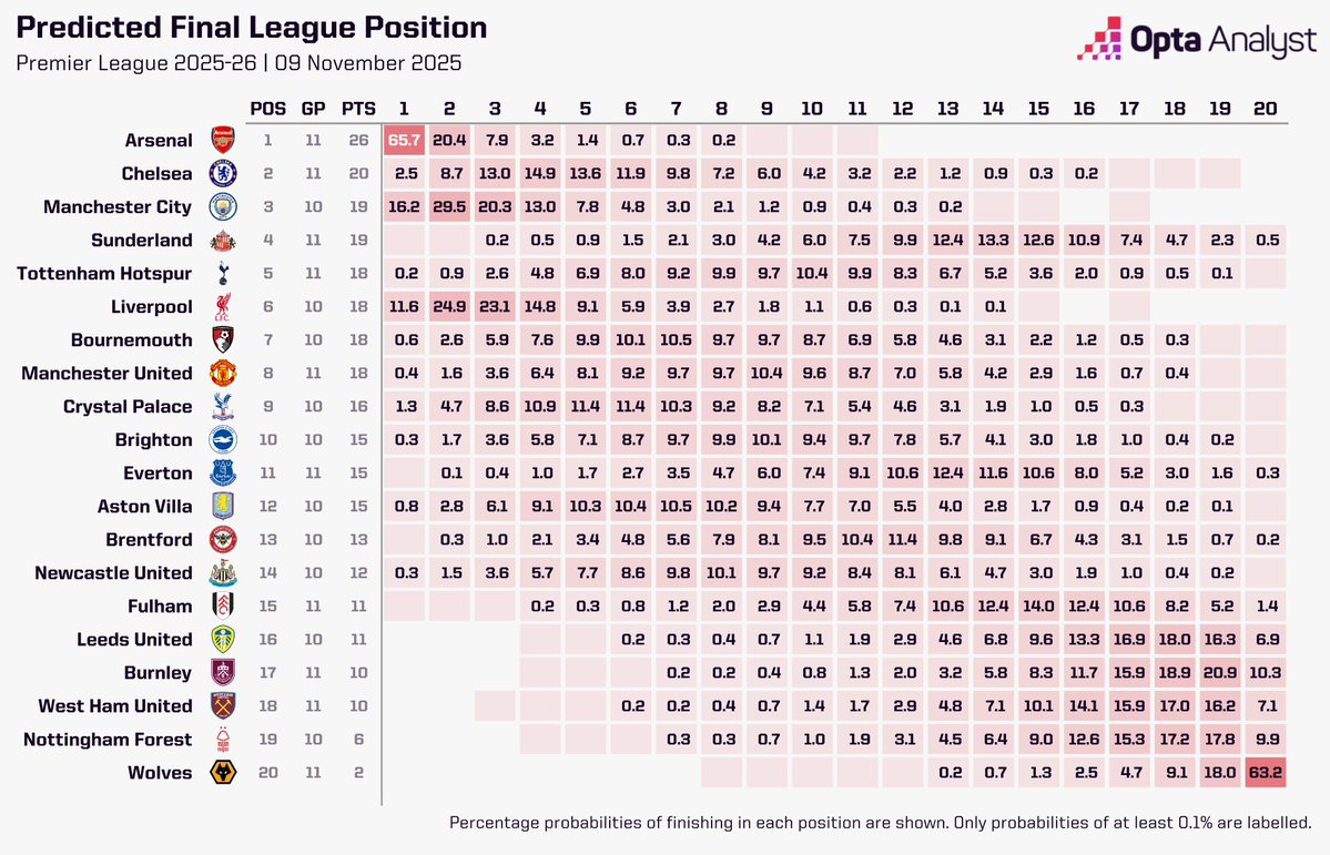虎撲11月09日訊 OPTA報道:盡管昨天在桑德蘭戰(zhàn)平,阿森納在OPTA超級計算機當前模擬中仍以65.7%的管客冠概率贏得2025-26賽季英超冠軍。