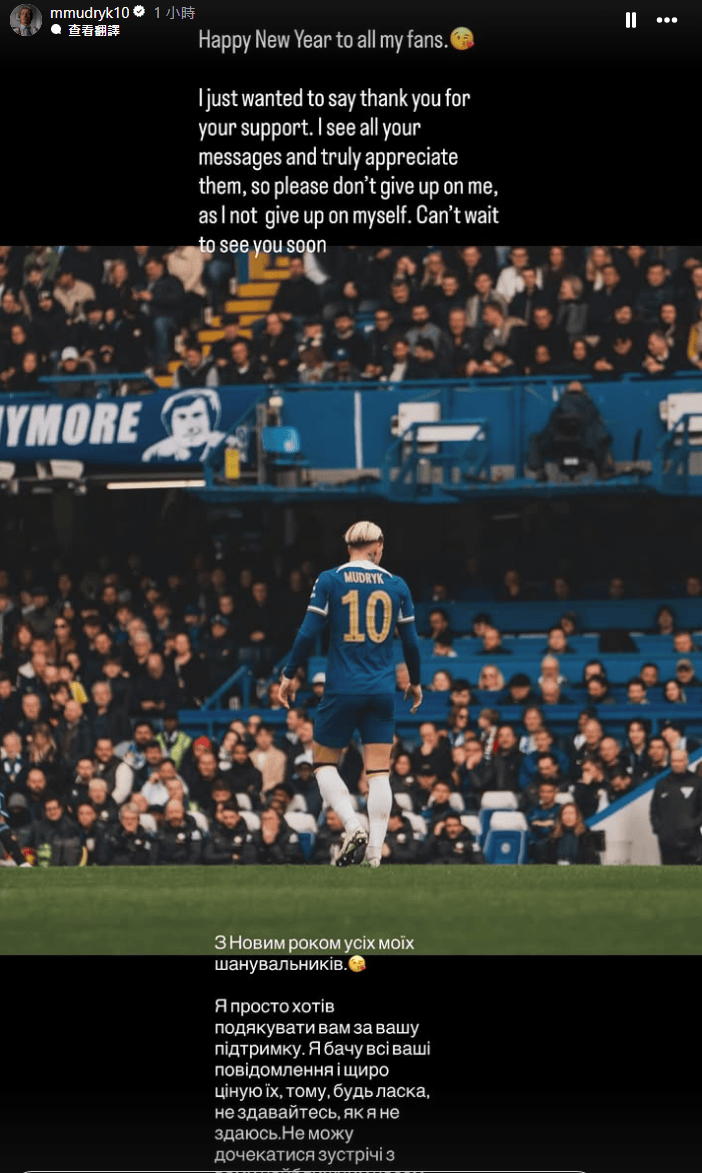 虎撲01月01日訊 切爾西邊鋒米哈伊洛-穆德里克在Instagram上發(fā)布新年祝福。