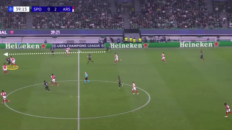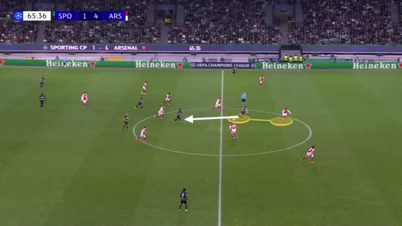 與葡萄牙體育相比,阿森納的進(jìn)攻組織更為謹(jǐn)慎,通過(guò)輪換來(lái)操控對(duì)手的防守陣型。他們更喜歡地面?zhèn)髑蚺浜?,試圖穿透或繞過(guò)對(duì)手,而不是早早長(zhǎng)傳。