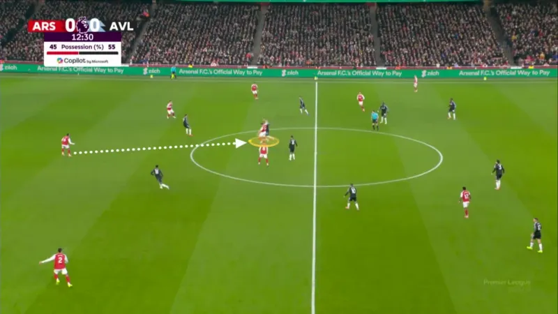 在對(duì)陣阿斯頓維拉的比賽中,哲凱賴什回撤協(xié)助組織進(jìn)攻,但防守者憑借身體對(duì)抗斷下球,阿森納險(xiǎn)些丟球。(圖六)