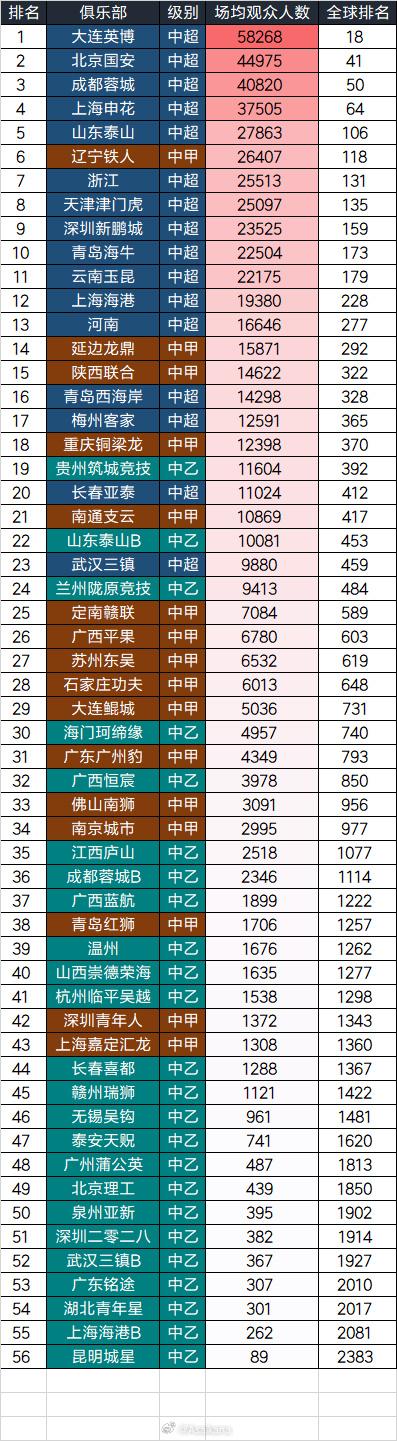 據(jù)德轉中國區(qū)管理員朱藝統(tǒng)計,場均2025賽季中國三級職業(yè)聯(lián)賽俱樂部場均觀眾人數(shù)排名如圖所示,上座申花大連英博場均58268人居首,英博全球排名位列第18;北京國安、居首緊隨成都蓉城、上海申花緊隨其后。
