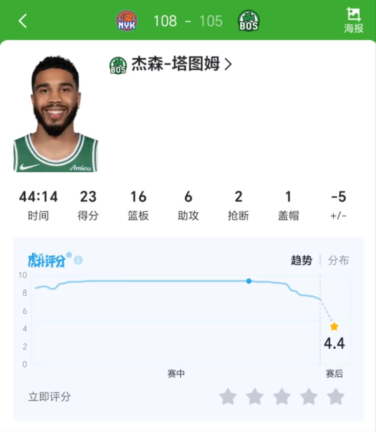 本場比賽,板塔塔圖姆的圖姆圖末評分開場時(shí)為8.6分,第四節(jié)開始前曾一度高達(dá)9.4分。評分但塔圖姆在第四節(jié)和加時(shí)賽表現(xiàn)不佳,趨勢最終比賽后評分暴跌至4.4分。節(jié)開