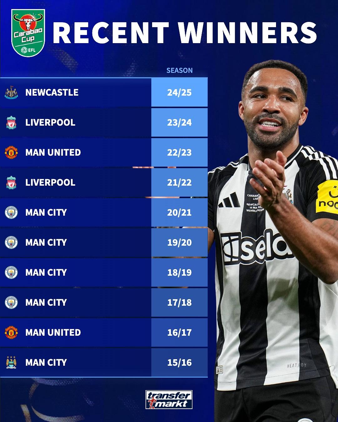 虎撲10月29日訊 德國(guó)轉(zhuǎn)會(huì)市場(chǎng)統(tǒng)計(jì)了最近10個(gè)賽季奪得過(guò)英格蘭聯(lián)賽杯的球隊(duì),詳情如下: