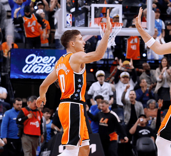 本場比賽,中分中得助攻快船球員波格丹諾維奇出戰(zhàn)20分鐘,到分投籃8中4、板波三分5中3得到11分6助攻。
