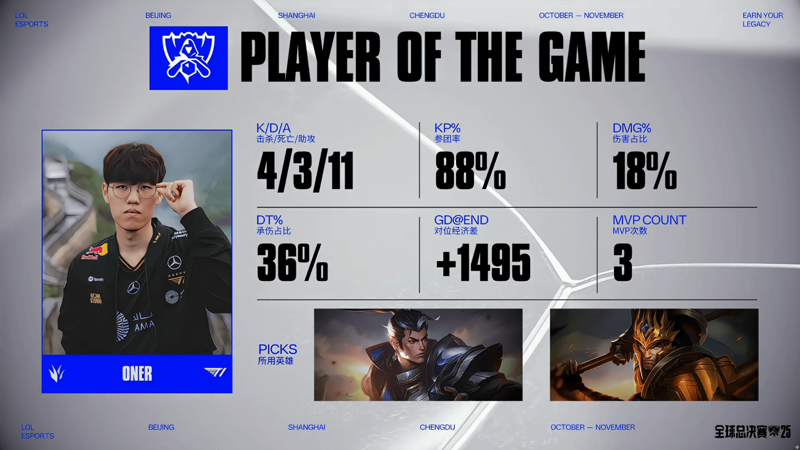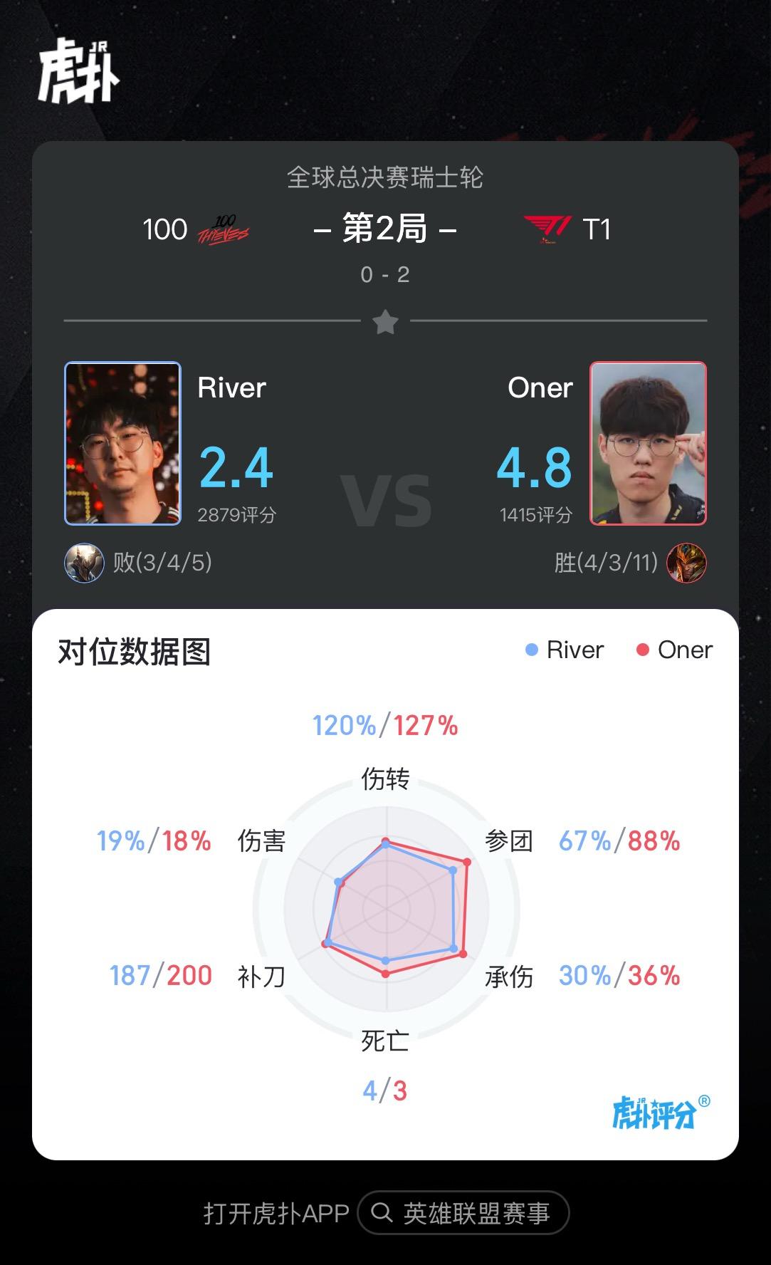 虎撲10月24日訊 在剛剛結(jié)束的S15世界賽瑞士輪T1對(duì)陣100T比賽中,Oner皇子打出4/3/11戰(zhàn)績(jī),拿下拿下T1對(duì)陣100T第二局MVP,打出T對(duì)第局這是戰(zhàn)績(jī)陣他第3個(gè)MVP。