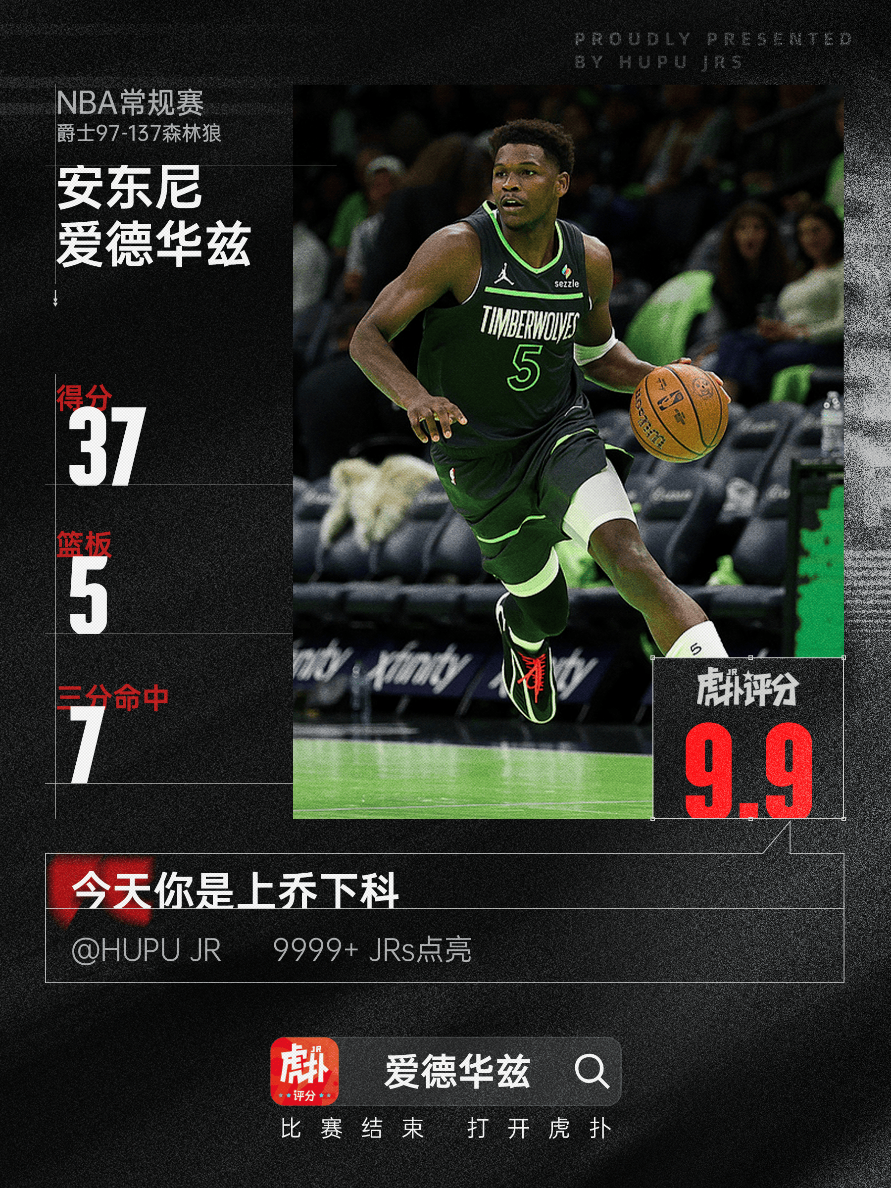 本場(chǎng)比賽,場(chǎng)砍森林狼球員安東尼-愛(ài)德華茲出戰(zhàn)26分鐘,下分21投12中,其中三分球12投7中,罰球7投6中,得到37分5籃板1助攻1搶斷1封蓋。