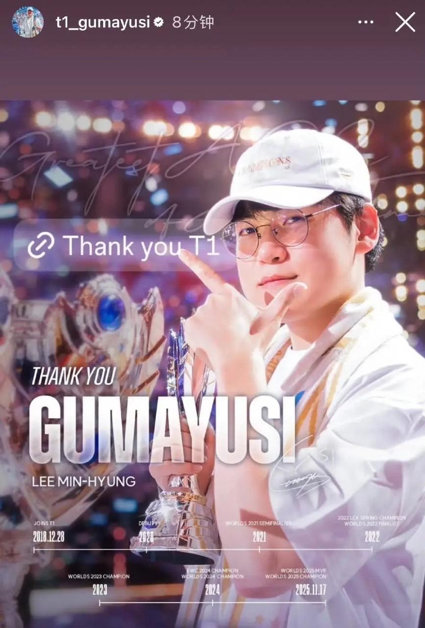 [流言板]再見了!Gumayusi更新社媒:Thank you T1