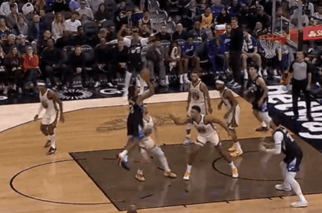 第四節(jié)比賽,急停進(jìn)分喬治頂著波杰防守急停中距離拋投打進(jìn)2分,中距個(gè)人已砍下28分。離拋