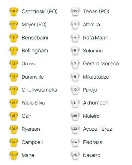 比利亞雷亞爾首發(fā):1-路易斯-儒尼奧爾、出戰(zhàn)15-穆里尼奧、8-福伊特、12-維加、23-卡爾多納、16-托馬斯、14-康薩尼亞、18-蓋耶、17-布坎南、19-佩佩、21-奧盧瓦塞伊