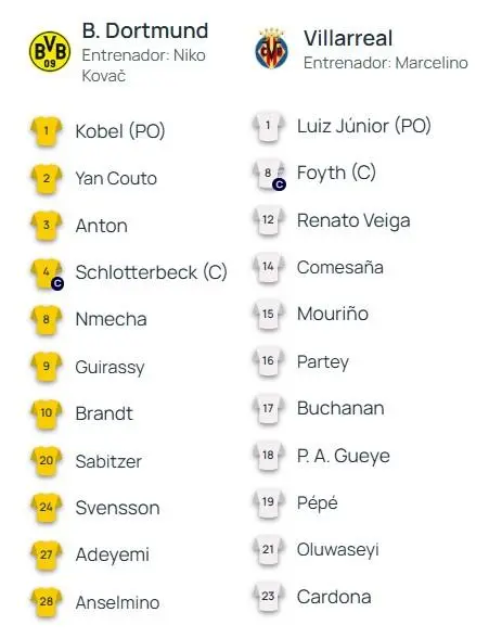 比利亞雷亞爾首發(fā):1-路易斯-儒尼奧爾、15-穆里尼奧、8-福伊特、12-維加、23-卡爾多納、16-托馬斯、14-康薩尼亞、18-蓋耶、17-布坎南、19-佩佩、21-奧盧瓦塞伊