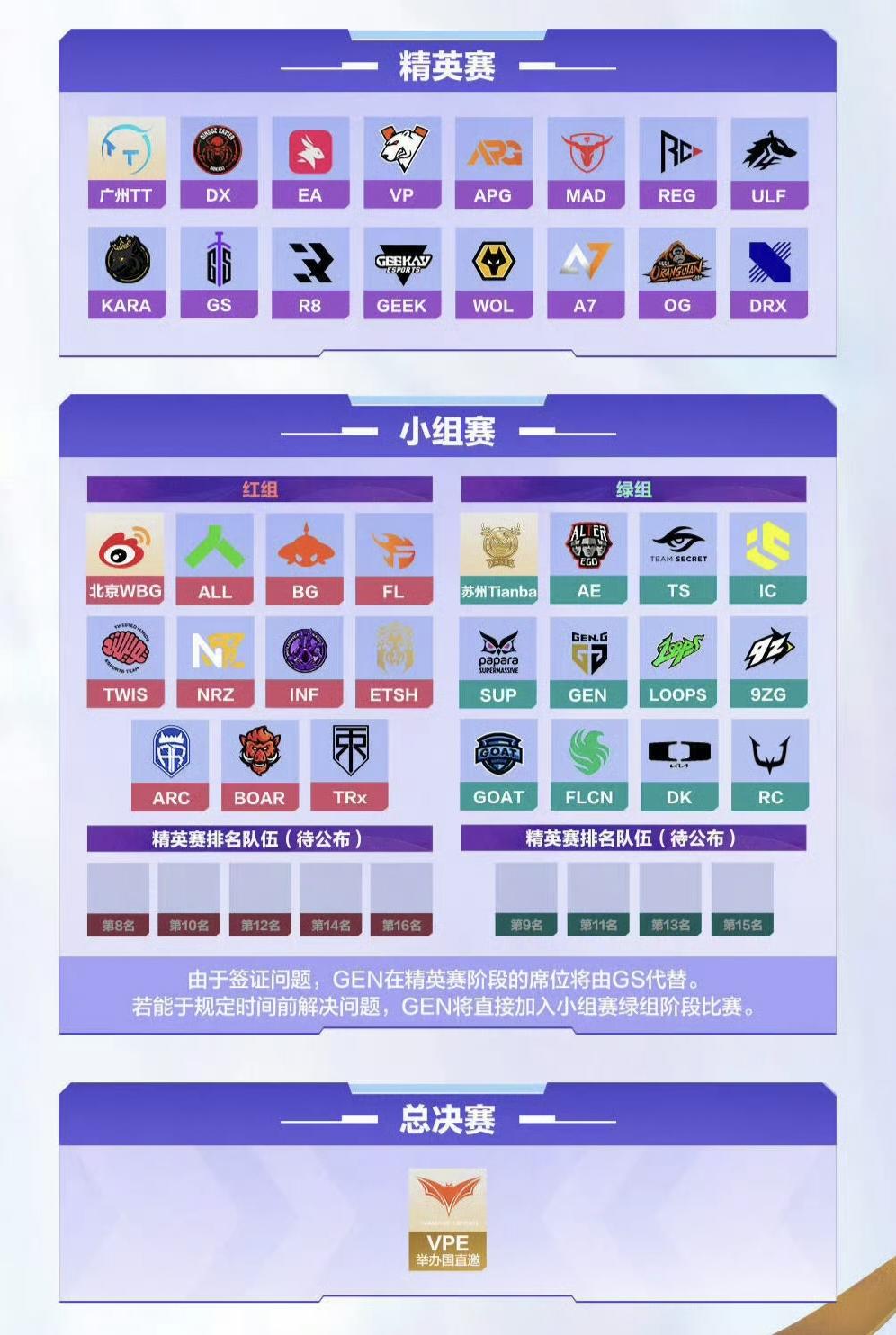 由于簽證問題,席位GEN在精英賽階段的未解席位將由GS代替。